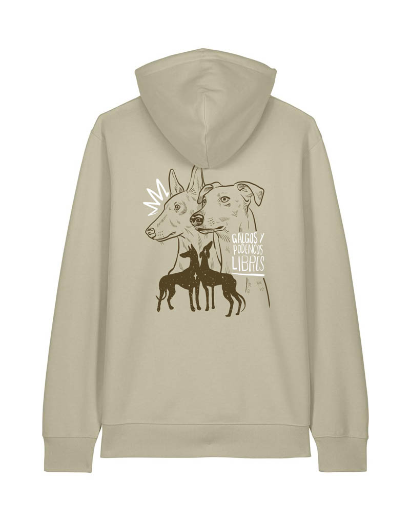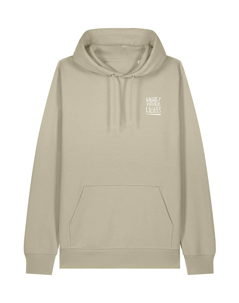 Sudadera capucha solidaria 100% algodón orgánico de 350gsm. Disponible en color “Stone”. Tintas ecológicas con certificado GOTS.