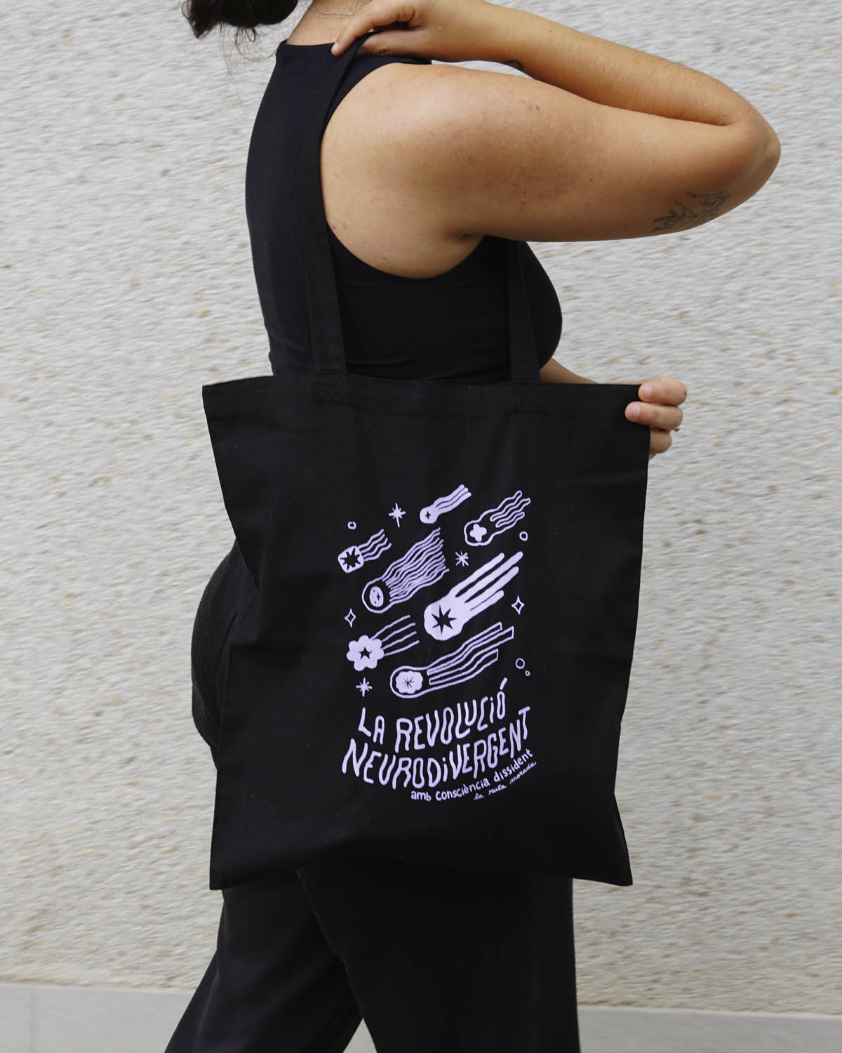 Aquesta totebag és solidària amb La Ruta Morada, una associació creada per persones neurodivergents, amb mirada feminista, interseccional i anticapacitista. La seva tasca és la d’empoderar dones i dissidències autistes, generant xarxes de suport i transformant els espais perquè siguin més accessibles i segurs.